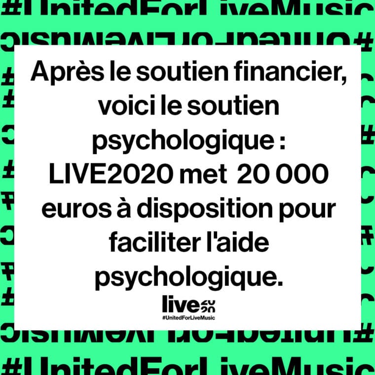 Grâce à l’asbl Un Pass Dans l’Impasse, les indépendants francophones de Wallonie et de Bruxelles avaient déjà un accès limité à l’aide psychologique. LIVE2020 met désormais de côté 20 000 euros pour une aide supplémentaire et donne un coup de pouce financier à ceux qui veulent se remettre sur les rails mentalement. Toute personne ayant travaillé dans le secteur musical belge pendant au moins un an au cours des trois dernières années peut se faire rembourser huit séances chez un·e psychologue ou un·e psychothérapeute. Les demandes d’intervention sont possibles pour autant que le budget le permette. Tous les détails sont disponibles ici. Si vous préférez une réorientation professionnelle ou une orientation de carrière, vous pouvez vous tourner vers le Bilan de compétences ou le programme Konvertigo du Fonds 304.