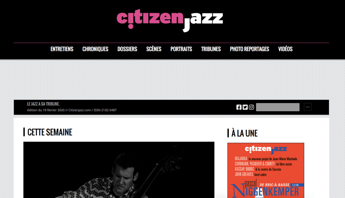 Premier magazine de jazz en ligne. Depuis 2001, tous les lundis. Un sommaire complet avec des entretiens, des articles, des chroniques de disques, des photo reportages, des playlist, des dossiers thématiques reflétant l’actualité du jazz en France et en Europe.