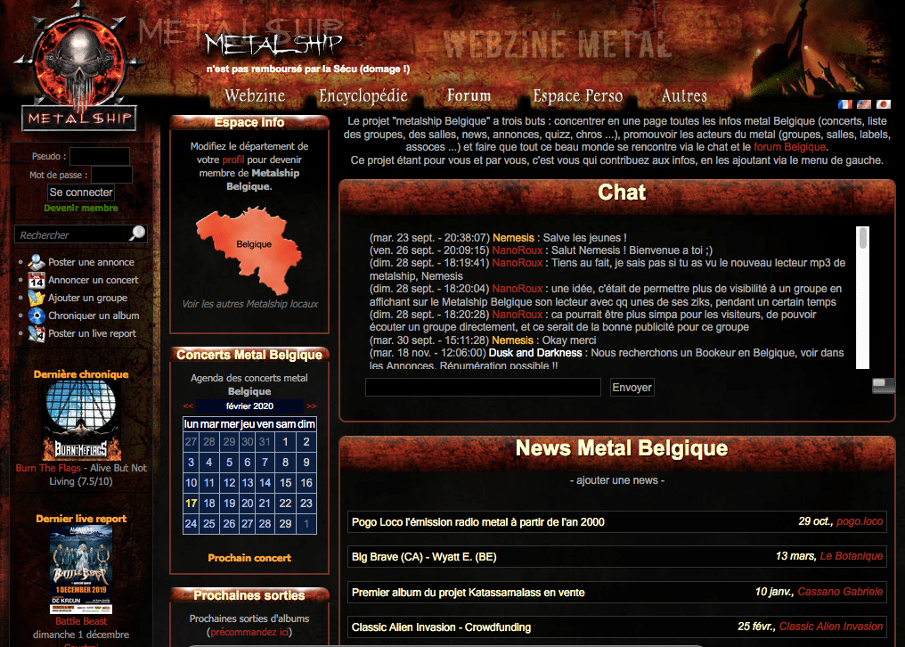 Le projet “metalship Belgique” a trois buts : concentrer en une page toutes les infos metal Belgique (concerts, liste des groupes, des salles, news, annonces, quizz, chros, etc), promouvoir les acteur·ice·s du metal (groupes, salles, labels, assoc’, etc) et faire que tout ce beau monde se rencontre via le chat et le forum Belgique.